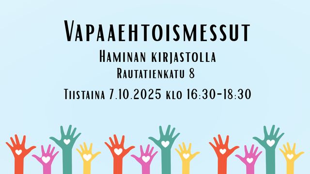 Vapaehtoismessut Haminan kirjastolla! Vapaaehtoismessut järjestetään tiistaina 7.10.2025 klo 16:30-18:30 Haminan pääkirjastolla. Tapahtumassa voit esitellä oman yhdistyksen vapaaehtoistoimintaa ja saada mukaan uusia…