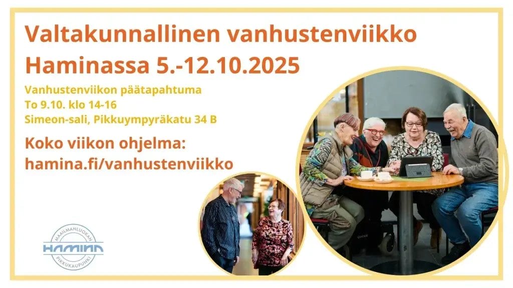 Vanhustenviikkoa vietetään tänä vuonna 5.-12.10.2025 teemalla Onni kasvaa yhteisössä. Pääjuhla torstaina 9.10.2025 klo 14-16 Simeon salissa. Tervetuloa nauttimaan kaikille avoimesta, maksuttomasta ohjelmasta!