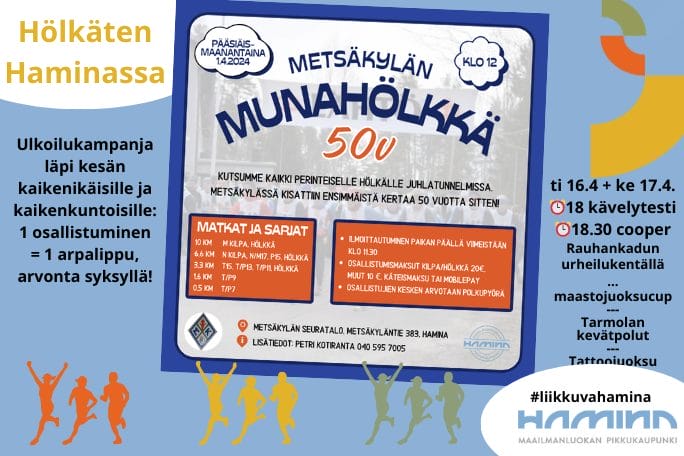 Hölkäten Haminassa -kampanja kannustaa kaikenikäisiä, -kokoisia ja -kuntoisia kävelemään, hölkkäämään ja juoksemaan – osallistumaan erilaisiin liikkumistapahtumiin.