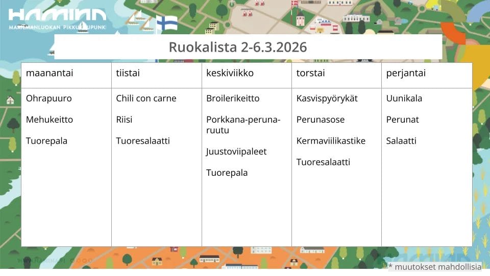 | Ohrapuuro | Chili con carne | Broilerikeitto | Kasvispyörykkä | Uunikala |