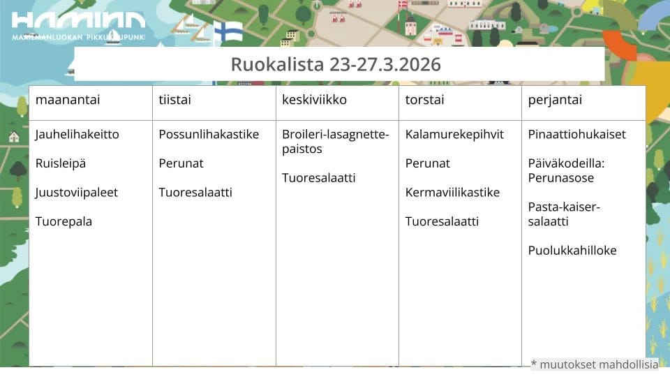 | Jauhelihakeitto | Possunlihakastike | Broilerilasagnette | Kalamurekepihvit | Pinaattiohukaiset |