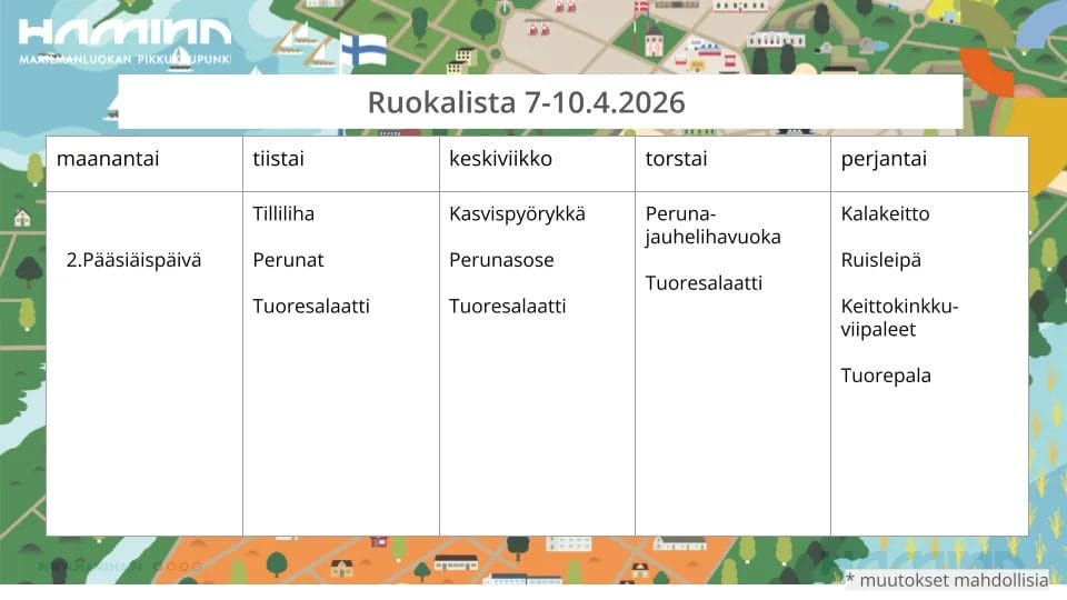 | 2. pääsiäispäivä | Tilliliha | Kasvispyörykät | Peruna-jauhelihavuoka | Kalakeitto |