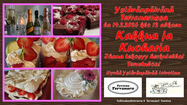 Ystävänpäivänä la 14.2.2026 herkutellaan Cafe’ Tuulitanssin suussa sulavilla herkuilla Taverna Tervanarun kakkupuffassa. Jälkkäriksi burgereita tai sitten toisin päin. Palan painikkeeksi…