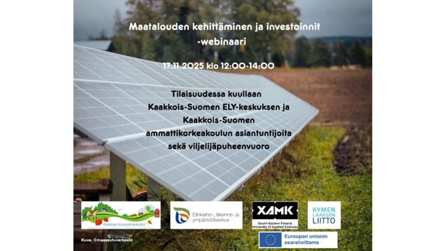 Haminan maaseutupalvelut järjestää Maatalouden kehittäminen ja investoinnit -webinaarin maanantaina 17.11.2025 klo 12:00-14:00. Tilaisuuden aiheena ovat maatalouden kehittäminen ja investoinnit sekä…