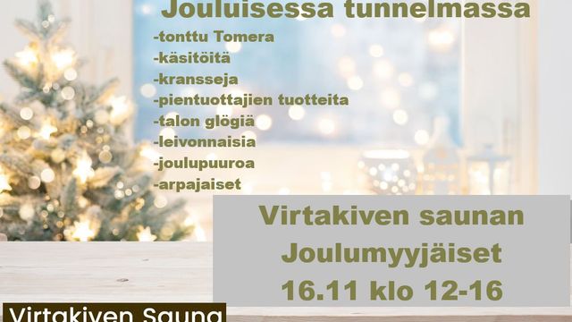 Jouluisessa tunnelmassa  -tonttu Tomera -käsitöitä -kransseja -pientuottajien tuotteita -talon glögiä -leivonnaisia -joulupuuro -arpajaiset
