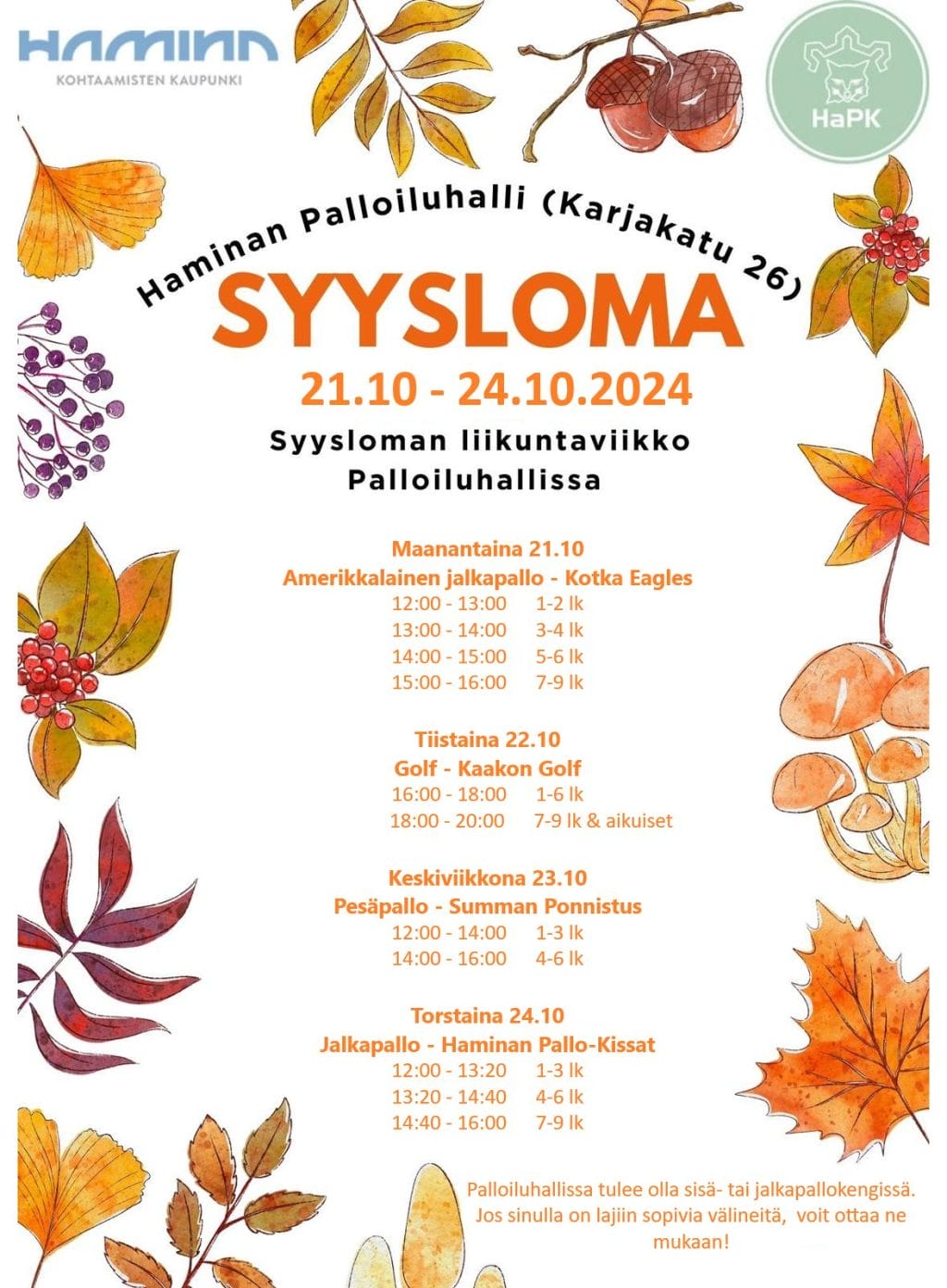 p.s. Palloiluhallin syysloman liikuntatarjonta